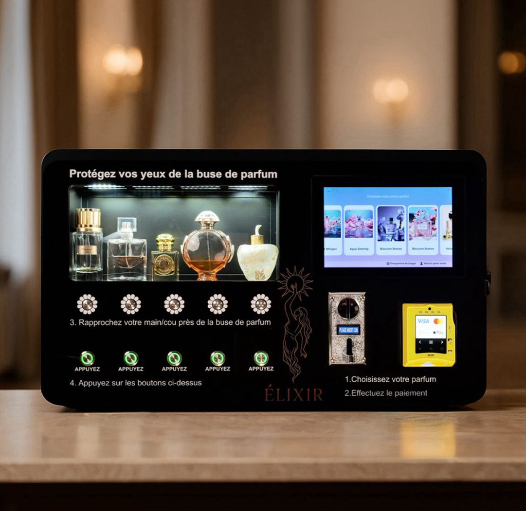 C’est une invitation au voyage olfactif. En un geste, en déposant une pièce, vos visiteurs, clients ou collaborateurs peuvent déclencher une vaporisation raffinée de parfum, soigneusement sélectionnée parmi différentes fragrances. Pensée comme un véritable objet de design, Élixir allie technologie, élégance et convivialité. Elle transforme un hall d’accueil, un espace lounge, une boutique, un hôtel ou même un événement privé en lieu d’émotions et de souvenirs uniques.